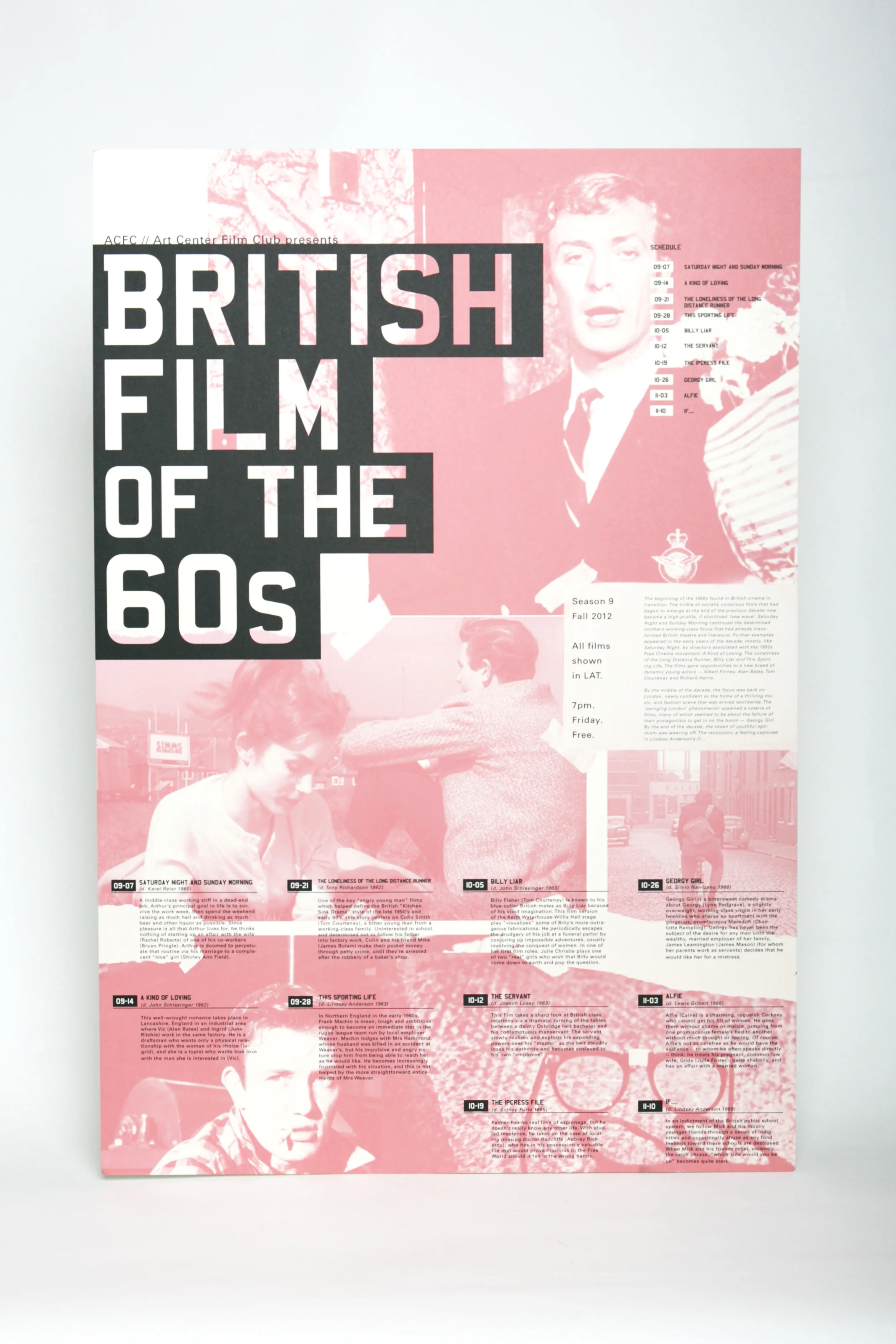 This poster for Art Center’s Film Club can be cut down and folded into a french-fold pamphlet, displaying the movies being shown each week. The theme of the movie series was British films of the 1960s, which inspired the use of coral pink and high contrast photography.