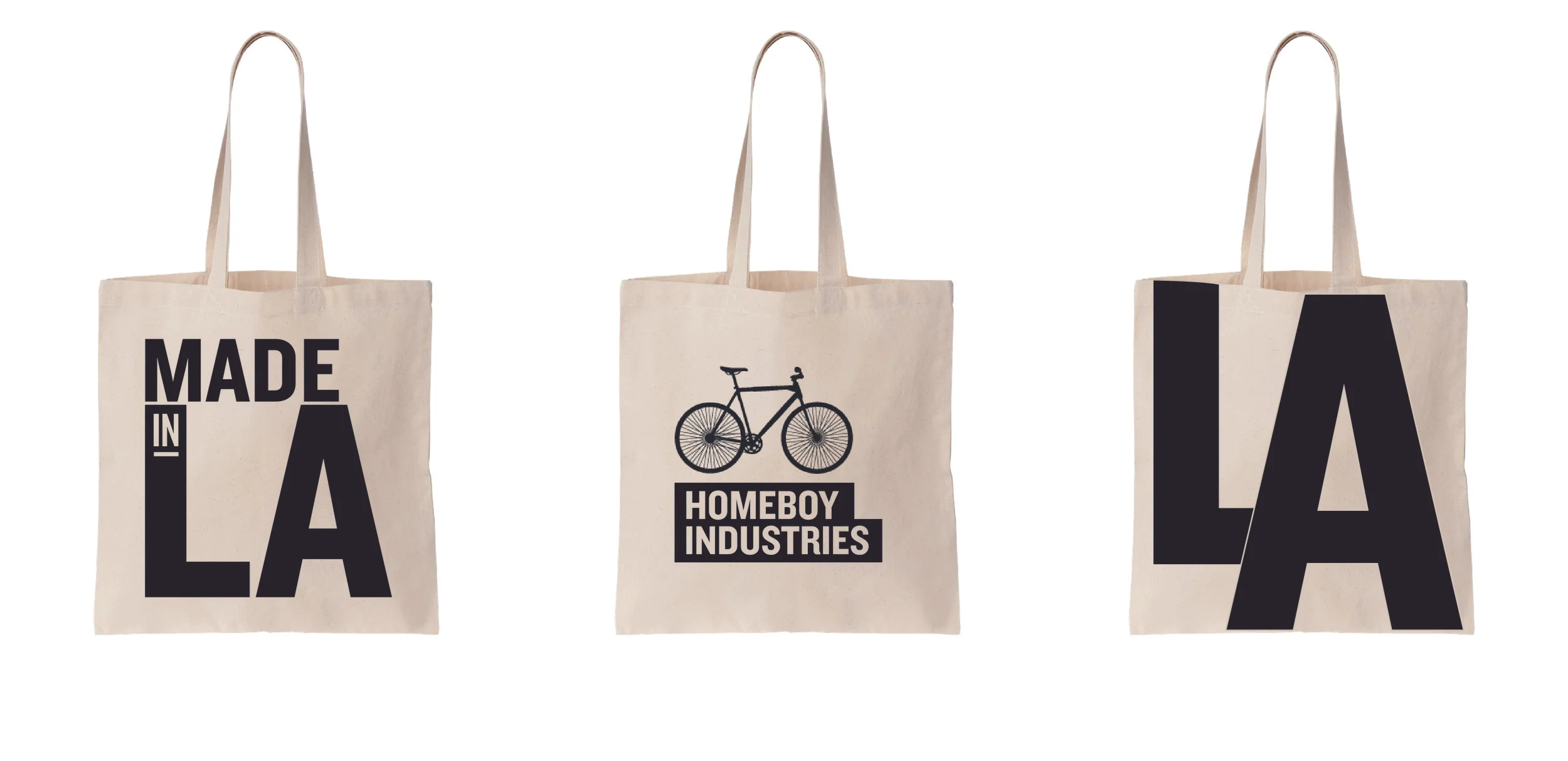 Because Homeboy Industries also has a silkscreen and embroidery division, custom t-shirts and tote bags celebrate 25 years of service and change. The first shirt design is a bike pattern, referencing how Father Greg first started working with gangs by riding around neighborhoods on his bike. The second shirt is a jersey style t-shirt design to commemorate 25 years of hope through Homeboy Industries.